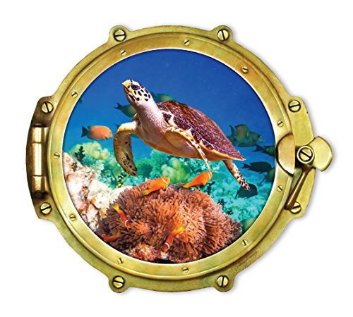 Walls 360 Peel & Stick Porthole Wall Decal Sea Turtle Swimming with Fish (12 in x 10.5 in)