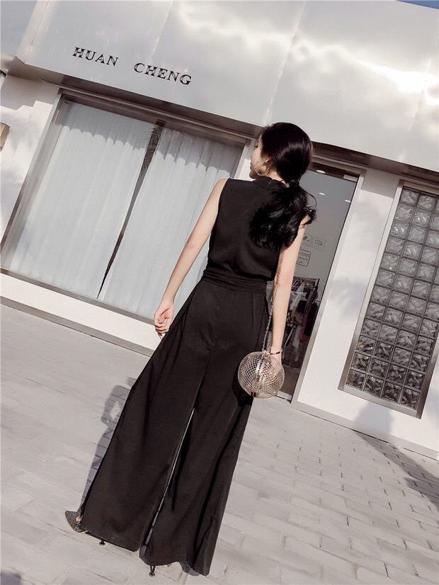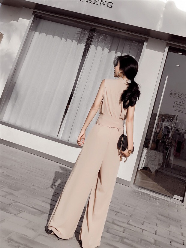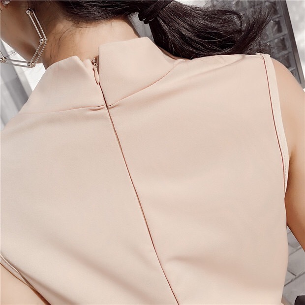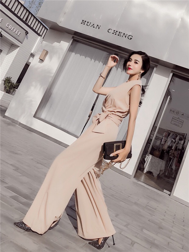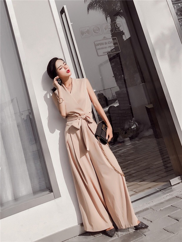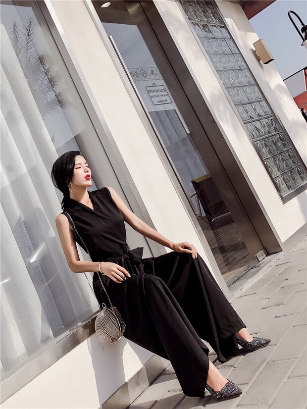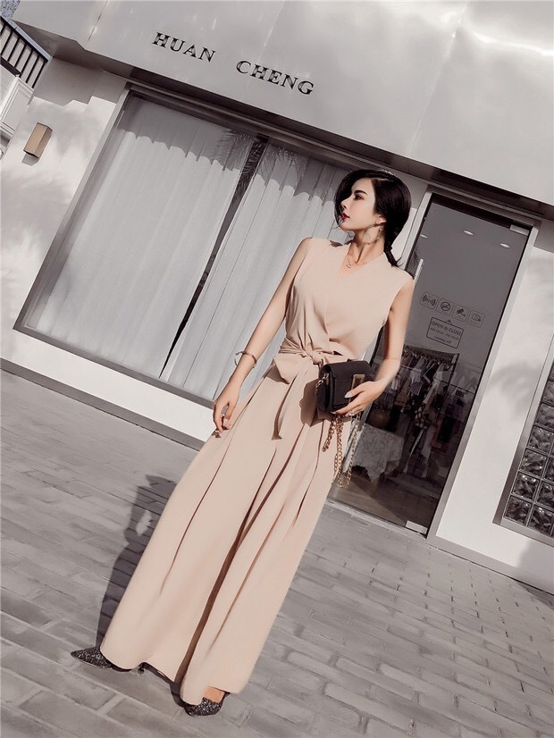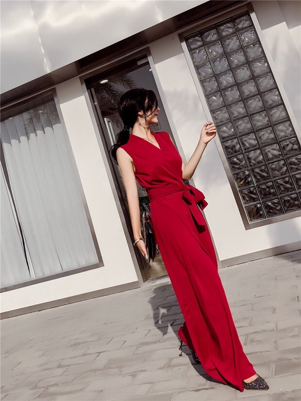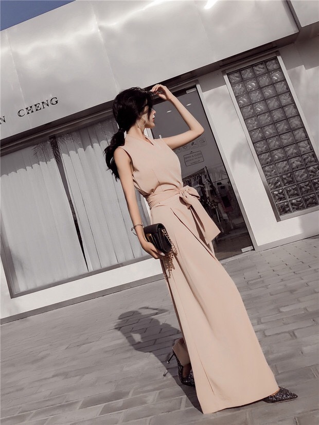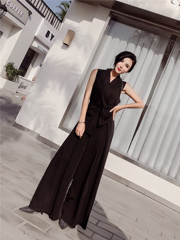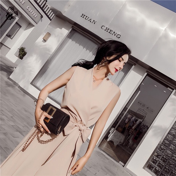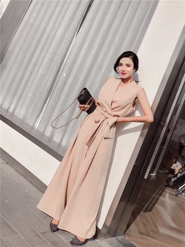 大きなウエストリボンがポイントのノースリーブオールインワン。