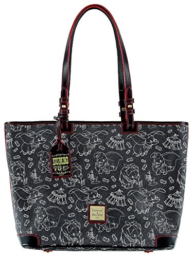 Celebrate the 75th Anniversary of Walt Disney's Dumbo carrying this leather Leisure Shopper by Dooney & Bourke. Covered in expressive animation sketches of Dumbo and Timothy, it's a bountiful tote bag for daily flights of fancy. Dumbo 75th Anniversary design * Dumbo and Timothy Mouse sketch pattern* Screen art* Leather trims with contrast edging Zip top closure with braided leather zipper pull Interior zippered pocket Three interior open pockets Fully lined Interior leather key strap with toggle clasp Carry handles Metal feet Silvertone hardware Dumbo 75th Anniversary logo leather tag Walt Disney's animated classic Dumbo premiered October 23, 1941 ''Dooney & Bourke Since 1975'' embossed leather label inside ''Dooney & Bourke'' embossed metal label on front Coated Cotton / metal Bag: 12'' H x 17'' W (at top, 14'' W at bottom) x 6 1/4'' D Handles drop 12'' L