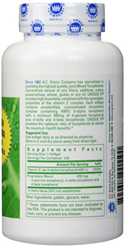 -. Binding : Health and Beauty -. Brand : Unique E® -. EAN : 0894612001100 -. Feature : It provides the HIGHEST biological activity of a concentrate formula. / Provides maximum antioxidant function. / Supports healthy circulation. / Has high d-Gamma Tocopherols to help neutralize free radicals. / Contains NO SOY, or other OIL FILLER additives or allergens. -. IsAdultProduct : 0 -. Label : A.C. Grace -. LegalDisclaimer : No products are intended to diagnose, treat, cure or prevent any disease. -. Manufacturer : A.C. Grace -. MPN : 894612001100 -. PackageQuantity : 1 -. PartNumber : 894612001100 -. ProductGroup : Health and Beauty -. ProductTypeName : HEALTH_PERSONAL_CARE -. Publisher : A.C. Grace -. Studio : A.C. Grace -. Title : UNIQUE E 120 Softgels -. UPC : 894612001100