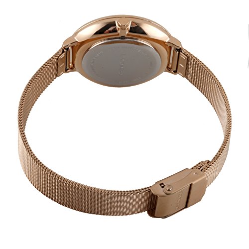 A rose gold stainless steel case surrounds a champagne sun-ray dial featuring rose gold hour, minute, and second hands. Rose gold indexes mark the hours. A mineral crystal protects the dial. The slim rose gold stainless steel mesh bracelet fastens securely with a hook buckle clasp. A reliable Japanese quartz movement keeps time. This watch is water resistant at 3 ATM.Feature