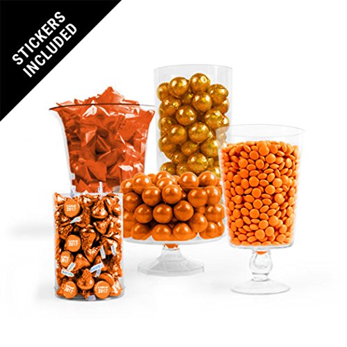 -. Feature : Includes: two 7oz Bags Buttermints (56pc/bag), 2lbs Just Candy Milk Chocolate Minis, 2lbs Caramel Filled Balls, 2lbs Gumballs, 1lb Hershey's Kisses, 1 Sheet 3/4" Stickers (108ct) / Containers not included / Assembly Required / Feeds 24