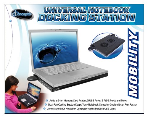-. Binding : Personal Computers -. Brand : iConcepts -. Color : Black -. EAN : 0021331106179 -. Feature : Keeps your notebook cool and ventilated / Connects to your notebook via the included USB cable / Dual fans for additional cooling / Fits all sizes of notebooks / Also includes 9 in 1 memory card reader, 3 USB 2.0 ports, and 2 PS/2 Ports -. Label : iConcepts -. Manufacturer : iConcepts -. Model : M10617-MB -. MPN : M10617-MB -. PackageQuantity : 1 -. PartNumber : M10617-MB -. ProductGroup : CE -. ProductTypeName : COMPUTER_ADD_ON -. Publisher : iConcepts -. Studio : iConcepts -. Title : iConcepts M10617-MB Universal Notebook Docking Station -. UPC : 021331106179 -. Warranty : 1 Year