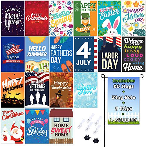Fat Zebra Designs Seasonal Garden Flags Set | 19 Pack Assortment of 12-inch x 18-inch Flags | Includes Garden Flag Pole, Wind Clips and Stopper | Double-sided, Polyester, Durable