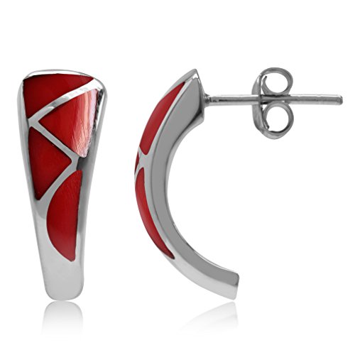 -. Title : Created Red Coral Inlay White Gold Plated 925 Sterling Silver Post Earrings