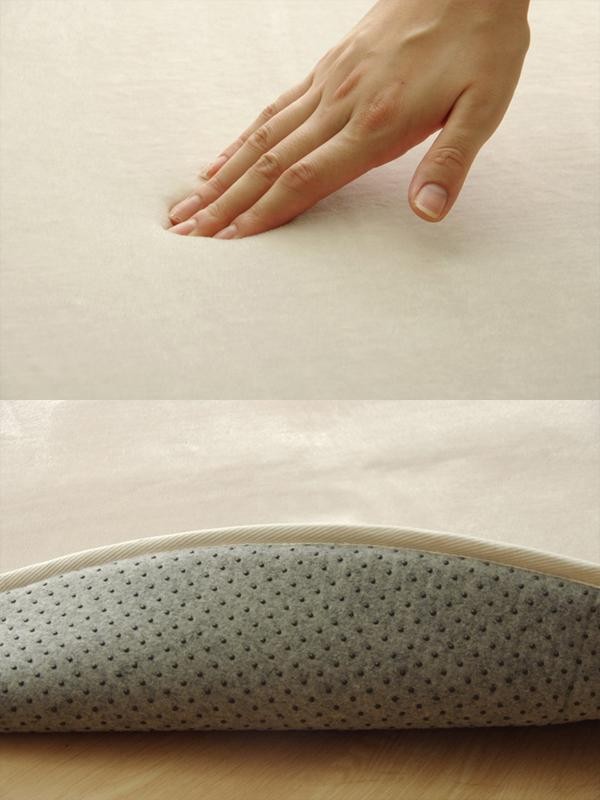 | 生地に抗菌・防臭加工を施したラグカーペットです。しっとりとして非常に柔らかいフランネル生地を使用しています。中材には低反発ウレタン18mmを使用しています。プニプニとした柔らかい感触とボリューム感をお楽しみ下さい。 |