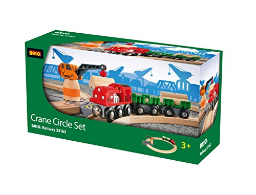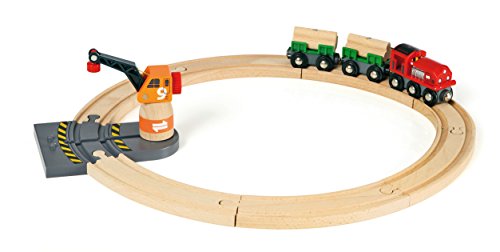 -. Feature : aus Holz und Kunststoff / BRIO Bahn Set mit 15 Teilen / Anlagengröße: 450 x 480 mm / Mit verschiebbarem Kran und einer Schiebelok mit aufklappbarer Motorhaube / 2 Wagen mit Magnetladung und Schienen