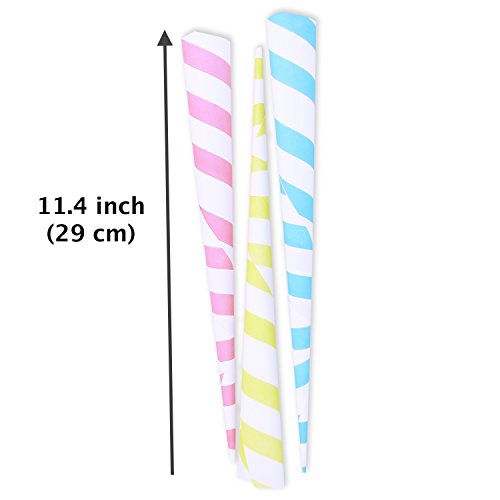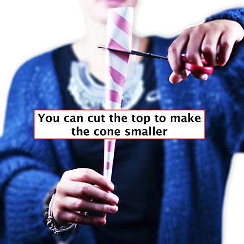 - SAFE AND CUSTOMIZABLE: Cones are made of food grade paper thus perfectly safe for cotton candy consumption but non edible. The length of every cone is 11,4 inches (29cm) and the width on top is 1,4 inches (3,5cm). Cones can be made smaller by cutting off a part of the top. This trick can be useful to make a couple of cute little cones if desired.