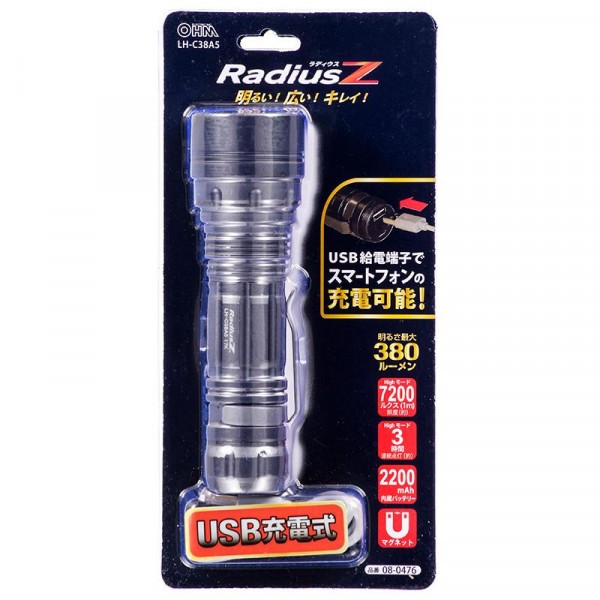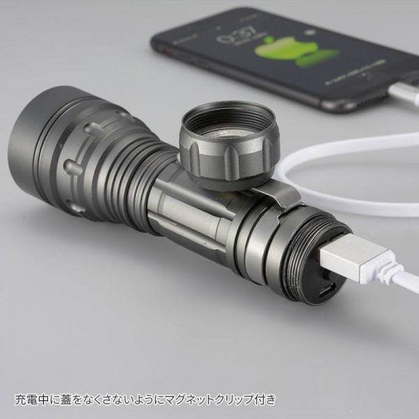 USB充電式のLEDズームライトです。リチウムイオンバッテリーを内蔵しているので、繰り返し充電して使用できます。
