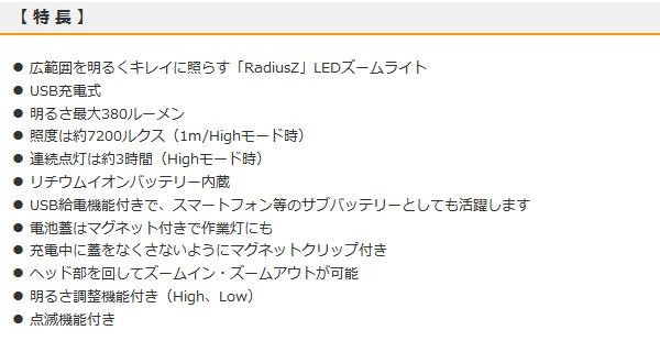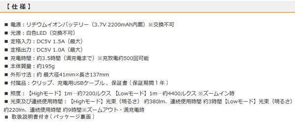 fk094igrjsUSB充電式のLEDズームライトですリチウムイオンバッテリーを内蔵しているので、繰り返し充電して使用できます サイズ 個装サイズ:18×9×5cm 重量 個装重量:235g 製造国 中国 広範囲を明るくキレイに照らすLEDズームライト USB充電式のLEDズームライトですリチウムイオンバッテリーを内蔵しているので、繰り返し充電して使用できます