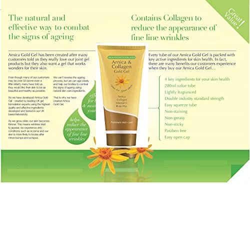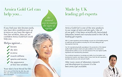Arnica Gold Gel has been formulated and laboratory tested by leading UK joint gel experts. It contains 4 key natural ingredients and includes a high collagen content which can help reduce the appearance of fine line wrinkles. It's non greasy, non sticky and paraben free. Arnica Gold Gel is not a medicine. only natural ingredients used and it is paraben free. Usage: We recommend you use Arnica Gold Gel gel up to 6 times a day. For a cooling effect, keep the gel in the fridge and apply after a warm bath. Store in a cool place. Arnica Gold Gel is not intended to replace any medication you are taking. ***Please visit your pharmacist or doctor if your symptoms persist. Ingredients Aqua, 1,3-Butylene Glycol, Collagen, Acrylates/C10-30 Alkyl Acrylate Crosspolymer, Sodium Ascorbyl Phosphate, Arnica Montana, Rosa Canina, Glycerin, Parfum, Propylene Glycol, Menthol, Polysorbate-20, Caprylyl Glycol, Phenoxyethanol, Hexylene Glycol, Potassium Hydroxide, Sodium Benzoate, Citronellol, Hexyl Cinnamal, limonene, Linalool, Hydroxyisohexyl 3 cyclohexane, carboxaldehyde, alpha- isomethyl Ionone.Feature