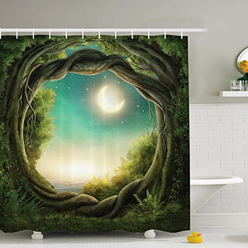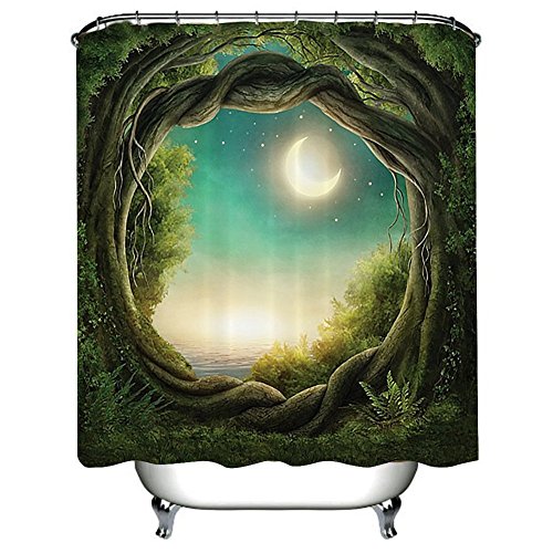 Shower Curtain Creative Print Fabric Waterproof & Antibacterial with 12Hooks (Green)