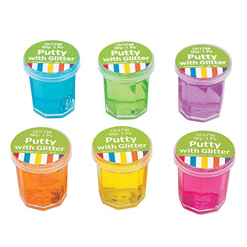 A room full of girls will have a blast with this glitter putty. 1 1/4" plastic containers of putty fun in green, blue, pink, purple, yellow, and orange. Box of 4 dozen in a set.Feature