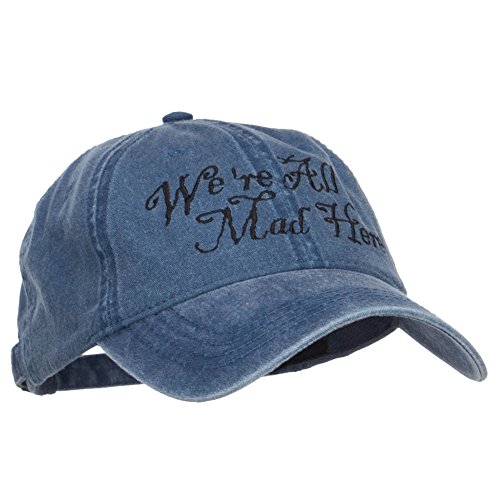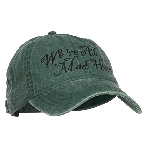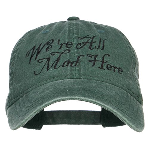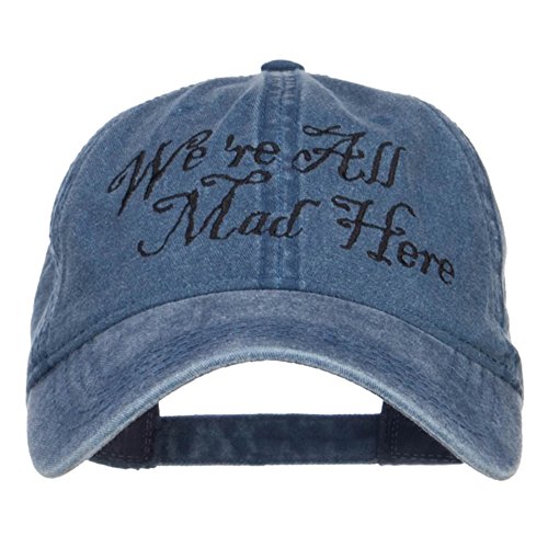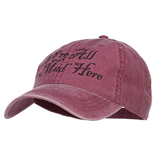 Binding : Apparel Product Description Phrase of We're All Mad Here are embroidered in black on the front. 1 small ventilation hole placed on each panel of crown. Bill is stiff and pre curved. Unconstructed crown. 6 panels. Low profile. Our We re All Mad Here Embroidered Cap is great for those who are crazy about Halloween. All Season. 8(W) X 11(L) X 4.5(H) inches. Thick, soft and light material. Available in different colors and styles. 0