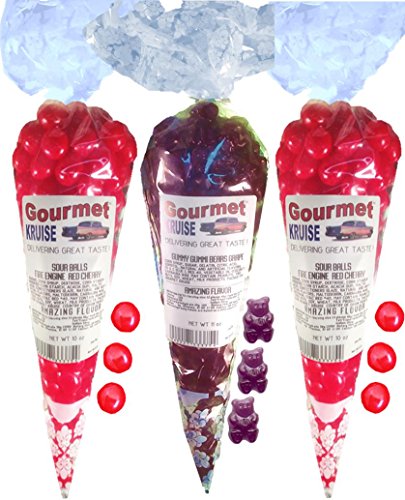 -. Title : Sour Balls (2) Fire Engine Red Cherry (1) Purple Grape Gummi Gummy Bears (NET WT 31 OZ) Gourmet Kruise Signature Gift Bags