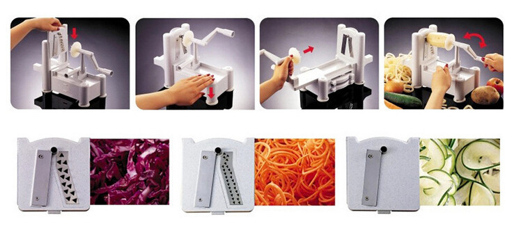 The slicer is an easy-to-use, handy tool that makes zucchini spaghetti, cucumber ribbon strands, curly fries or long, spiral apple strands. It comes with three blades: a shredder blade (small holes), a chipper blade (large holes) and a straight blade. A storage compartment beneath the frame stores two blades and the third blade comes already in place.