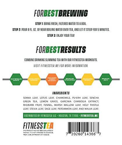 -. Feature : •TASTY ORGANIC SLIMMING HERBAL TEA | Ingredients include: Senna Leaf, Lotus Leaf, Chamomile, Pu-erh Leaf, Sencha Green Tea, Lemon Grass, Garcinia Cambogia Extract, Rhubarb Fruit, Fennel, Marsh Mallow Leaf, Holy Thistle Leaf, Stevia Leaf, Sage Leaf, Persimmon Leaf, and Malva leaf. We have blended these herbal teas together for calorie watchers, and weight watchers! / •REDUCE BLOATING: By consuming our Fitness Slimming Tea, say goodbye to temporary bloating, while improving your digestion! / •LOSE WEIGHT NATURALLY |At FitnessTea, we believe that losing weight should not be dull, and boring. Losing weight should be fun, and exciting! Our 14 Day FitnessTea may contribute to your slimmer summer body look! / •NATURAL APPETITE SUPPRESSANT & FULL OF ANTI-OXIDANTS: Our FitnessTea can serve as an appetite suppressant, and help you consume less food throughout the day. By suppressing your appetite, our 14 Day FitnessTea may help you lose weight Naturally! Additionally, Our premium tea is full of anti-oxidants. / HOT TEA PREPARATION | Step 1: Bring fresh, filtered water to a boil | Step 2: Pour 8 fl. oz. of near boiling water over tea, and let it steep for 5 minutes | Step 3: Enjoy your tea! | ICED TEA PREPARATION | Step 1: Bring fresh, filtered water to a boil | Step 2: Pour 8 fl. oz. of near boiling water over tea, and let it cool off for 30 to 45 minutes | Step 3: Add some ice, a hint of freshly squeezed organic lemon, and some organic honey to your tea | Step 4: Enjoy your iced tea with style!