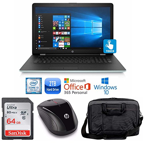 -. Feature : Bundle Includes: HP 17-bs012cy Core i3-7100 2TB HDD 15.6" HD Touch Screen Laptop / HP Wireless Mouse / SanDisk Ultra SDXC 64GB Memory Card / 17.3" Laptop Case / Features: Intel 7th Generation Core i3-7100U Processor / 8 GB DDR4 SDRAM / 2TB Hard Drive / 17.3" HD SVA WLED-backlit Touch Screen (1366 x 768) / DVD-Writer / Gigabit (10/100/1000) Ethernet / 802.11ac Wireless and Bluetooth / Backlit Keyboard with numeric keypad / TrueVision HD Camera / 2 USB 3.1 Gen 1 (Data transfer only); 1 USB 2.0; 1 HDM I/ Windows 10 Home / Microsoft Office 365 Personal 1-year ($69.99 Retail Value)