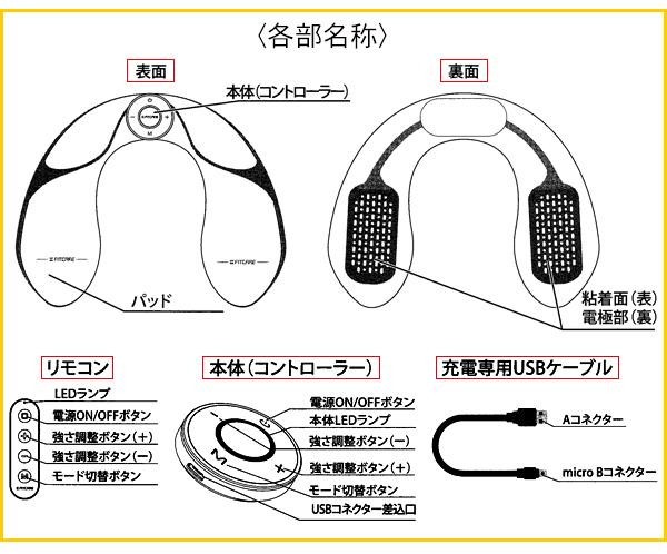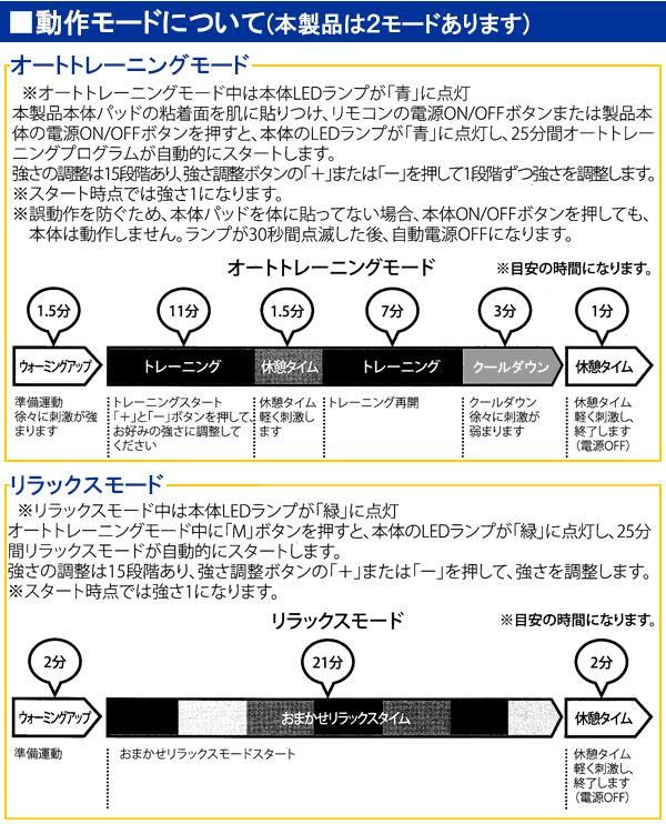 | 仕様 | ●強さ調整:15段階 ●充電ケーブル長:約0.3m ●パッド使用回数目安:約45回(1回25分間使用した場合) ●使用環境温湿度:0度~40度、20~80%RH ●保管環境温湿度:-10度~60度、20~80%RH ●自動電源OFF(約25分) ●無負荷電源OFF(約30秒) 【使用電源】 ●本体:USB充電式(1回1時間で約180分稼働) ●リモコン:コイン型リチウム電池(CR2032) 【動作モード】 ●トレーニングモード(4~35Hz低周波) ●リラクゼーションモード(1~116Hz) |