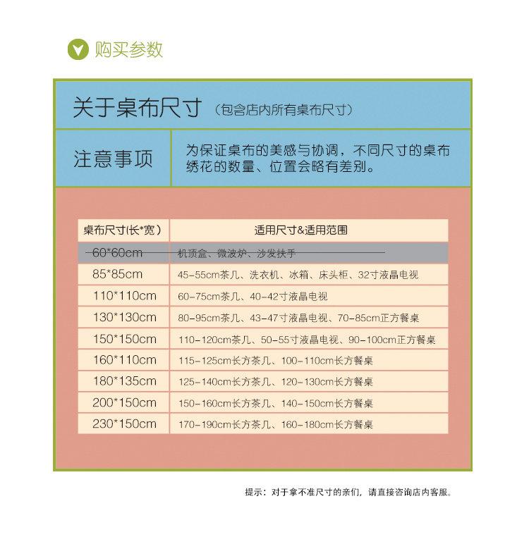 以下台布仅展示了部分尺寸,以供参考。各尺寸花型排列稍有不同。