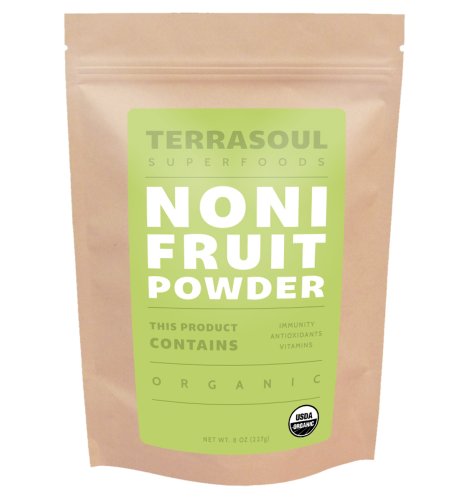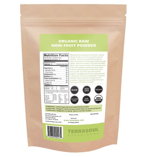 Believed to have originated in the warm, tropical climate of India, noni fruit is a potent source of vitamins, minerals and powerful antioxidants which are crucial for maintaining a healthy immune system. Noni fruit, known as "the queen of health plants", also contains all nine of the essential amino acids, the foundation of all life processes, which can't be made by the body so they must come from our diet. Our 100% pure, raw Noni Fruit Powder is carefully dried at low temperatures and is always free of carriers and excipients. Noni pairs well with citrus and berries in both juices and smoothies. Enjoy the many benefits of the noni fruit in your next drink concoction. Terrasoul Superfoods operates a state licensed, certified organic food processing facility and distributes the world's healthiest organic, nutrient-dense superfoods.