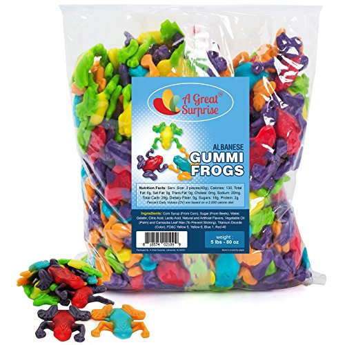 -. Feature : Albanese Rainforest Frogs are especially popular with children who will enjoy playing with their food as much as they do eating them. Each piece includes a solid frog shape with bent legs, webbed feet and a thick body with tapered head. The back includes subtle texture, recreating the look of real frog skin! / Our bulk rainforest frogs gummies come in a rainbow of fabulous colors. Each includes a two toned pattern, with limbs in one color and a body in another. These two-toned frogs have an assortment of bright colors and juicy fruit flavors: Strawberry & Grape, Sour Lemon & Sour Apple, Blue Raspberry & Orange. / Gummy frogs are a wonderful choice for kids birthday parties or any event with a rainforest or animal theme. Educators can encourage science studies by rewarding students with frog gummies. These Gummi Frogs are also a fun choice for cake decorating projects! / They are perfect for all occasions and are a unique, fun candy to include as party favors or to serve to guests as a snack. Beautiful enough to put on display in an elegant candy bowl for any candy buffet. / Buy in bulk to save money. Includes 5 lbs. Approximately 32 pieces per pound. Great candy that will be loved by kids of all ages (and adults too). Enjoy these sweet treats with many enticing flavors of the classic candy you crave. Items are repackaged in a facility that may contain milk, soy, peanuts, tree nuts, eggs, wheat and all other allergens.