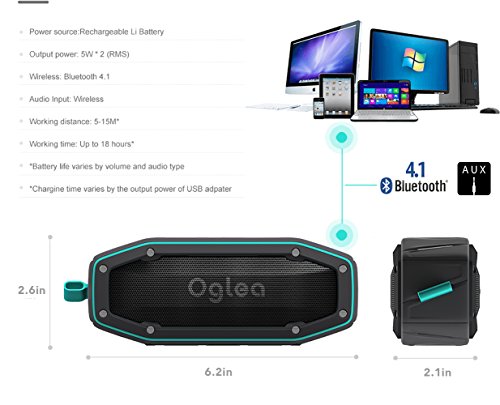 -. Binding : Electronics -. Brand : Oglea -. EAN : 0730060180281 -. Feature : [Bluetooth 4.1 & AUX]: Delivers a premium quality sound experience without any delay. 4.1 Bluetooth technology also allows speaker pairs with portable devices easier and more quickly. AUX line-in mode allows to play music without Bluetooth; AUX cable included in the box. / [Water-Resistance & Red Design]: This speaker is designed with IPX6 waterproof standard. It is rain, splash, and shower-resistant. / [Hands Free Talking]: Built-in microphone; you may enjoy it to answer telephone calls as a hands-free device. / [HD Sound]: 10+ watts internal powerful HD speakers provide high-quality sound and rich bass; Louder sound without distorting. / [Built-in Rechargeable Battery]: High capacity rechargeable 1000mAh battery is designed for up to 18 hours of playtime. -. IsEligibleForTradeIn : 1 -. Label : Oglea -. Manufacturer : Oglea -. Model : EL-2791 -. MPN : EL-2791 -. PackageQuantity : 1 -. PartNumber : EL-2791 -. ProductGroup : Speakers -. ProductTypeName : PORTABLE_AUDIO -. Publisher : Oglea -. Studio : Oglea -. Title : OGLEA Portable Wireless Bluetooth 4.1 Speaker with AUX, Outdoor IPX 6 Waterproof 10W 45mm Dual-Drivers, 18-Hour Playtime -. UPC : 730060180281
