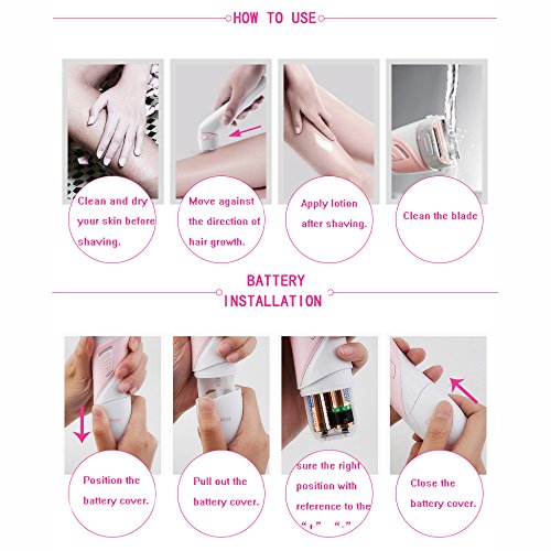 Feature : Waterproof design and battery operation: Tezam women shaver is waterproof design, it can be use dry or wet. Battery operation, do not need to charge it frequently, completely portable in travel .So you can shave easily whenever and wherever you want. / Adjustable shaver head of 45 degrees design: flexible shaver head and adjustable shaving angle designed to glide along body contours for outstanding ladies electric shaver closeness. / High grade steel cutting head and prevent allergy:Ladies shaver with super-sharp, hypo-allergenic inner blades help reduce irritation on sensitive skin for increased electric razor comfort. / Convenient Pop-up Trimmer: for the perfect finish, this electric personal shaver for women includes a handy pop-up trimmer for using as a bikini trimmer to create a clean bikini line and quickly remove unwanted long or stray hairs anywhere you find them. / Simply dismantle, conveniently clean up: the lady electric shaver is easy to clean up. Turn the switch to dismantle the shaver head, then clean it with cleaning brush or wash it in the cold or warm water.