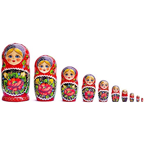 -. Title : 11" Set of 10 Girls in Floral Scarfs Wooden Russian Nesting Dolls