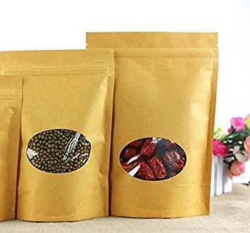 50PCS 5.1" x 7.9"Kraft Paper Pouches Flat Base Hermetic Bag-- Stand-Up pouch and Zip Lock Closure With Window Cutout for Candy Dried Fruits and Tea Nut