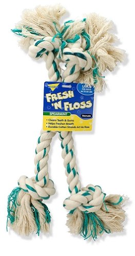 Studio : Petmate Aspen Pet Booda Publisher : Petmate Aspen Pet Booda Binding : Misc. Product Description Cleans Teeth and GumsHelps Freshen BreathDurable Cotton Strands Act As FlossSpearmint Flavored Fresh n Floss Cross helps to maintain good dental hygiene while freshening your pet breath between vet visits. The green strands act as floss to promote healthy gums. Ideal for large dogs 44 to 85 lbs. Caution: Not a food product. For chew and play only. Pets should be supervised when playing with this toy. Intended for pets only.Size approx.: 12in including fringe 0