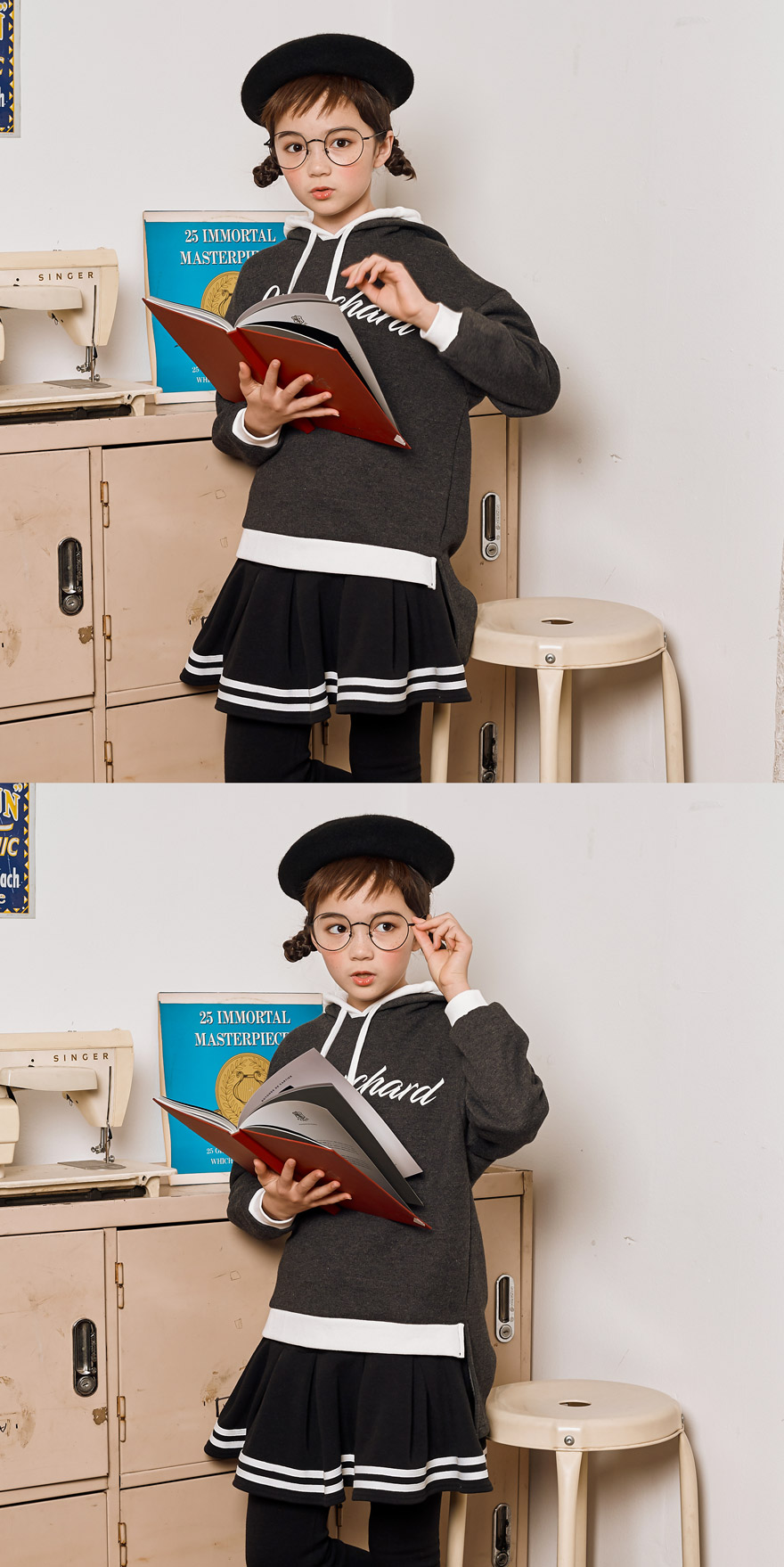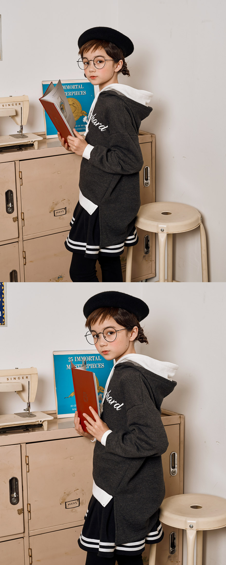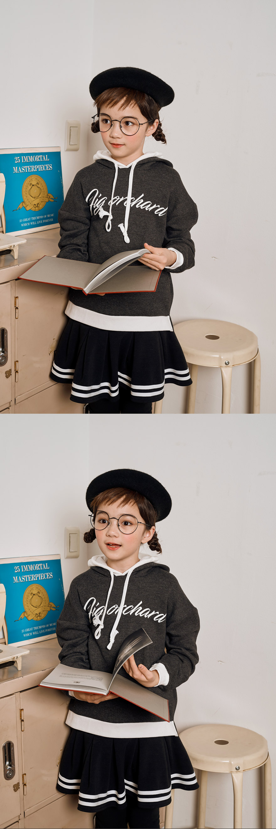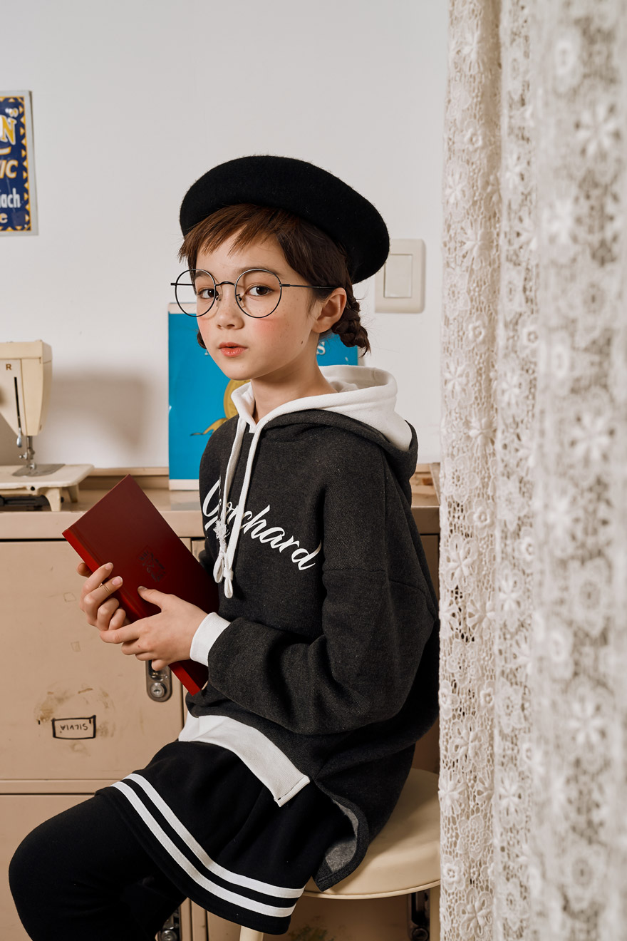 9, 11, 13, 15, 17호로 준비되어 있으며 하단에 측정된 사이즈 표를 참고해 주세요. 피팅한 여아 모델은 140cm에 31kg으로 다소 마른 체격이며, 딱 맞게 차콜 11호를 착용하였습니다. 깔끔한 핏으로 잘 맞네요 :)