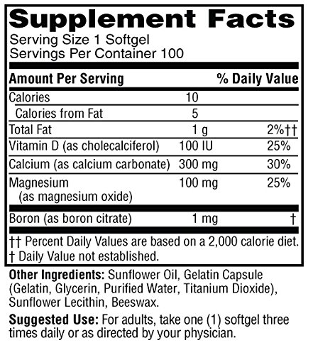 -. Feature : Eighty percent of those suffering from osteoporosis are women / Calcium is an essential mineral for nerve transmission, muscle and vascular contractions / Liquid Calcium has 300mg Calcium, 100mg Magnesium, 100IU of D3 and 1mg Boron per softgel / A great value for 100 easy to swallow softgels. / D3 is the most bioavailable form of D to support calcium absorption