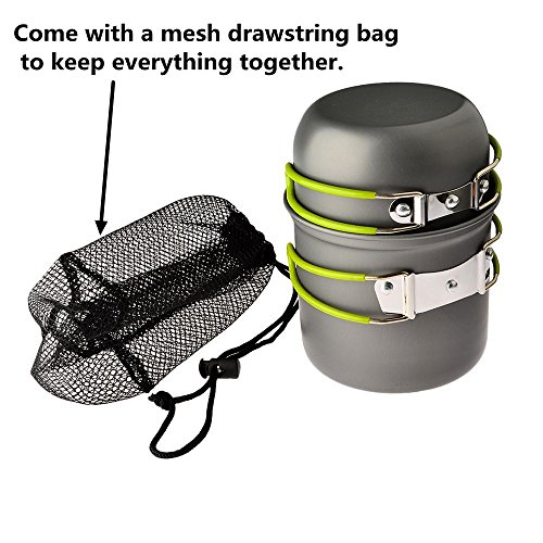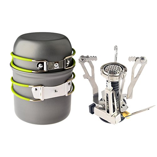 PERFECT OUTDOOR COOKING UTENSILS: 1 non stick pan pot bowl set + 1 collapsible piezoelectric ignition canister stove. Designed perfectly for 1-2 person.
