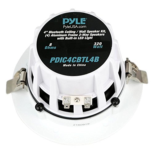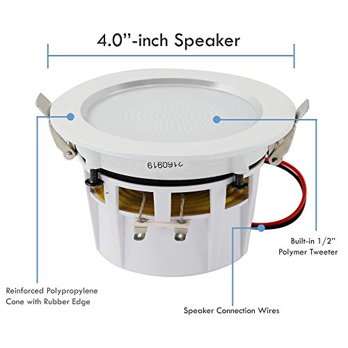Includes (4) 4.0’’-inch Speakers Bluetooth Wireless Music Streaming Lightweight Aluminum Alloy Frame Housing Built-in LED Light: High-Efficiency, Low Power Consumption 2-Way Full Range Stereo Sound Reproduction Built-in 1/2’’ Polymer Tweeter & 4-Ch. Digital Amplifier Spring-Loaded Clips for Easy Installation Reinforced Polypropylene Cone with Rubber Edge Simple Speaker Connector Post Mounts Flush on Walls or Ceilings Perfect for Custom Installations & Applications ABS Construction Bluetooth Connectivity: