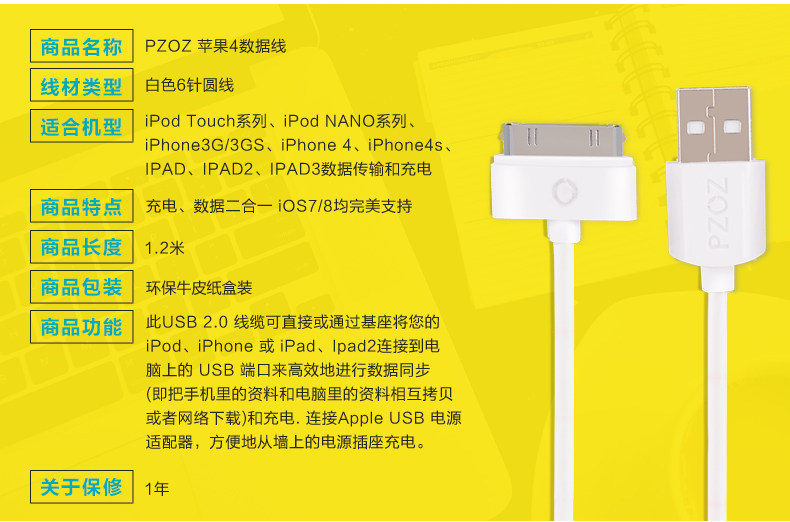 Pzoz iphone4手机充电器线iPhone4s数据线加长短ipad2/3四正品i4