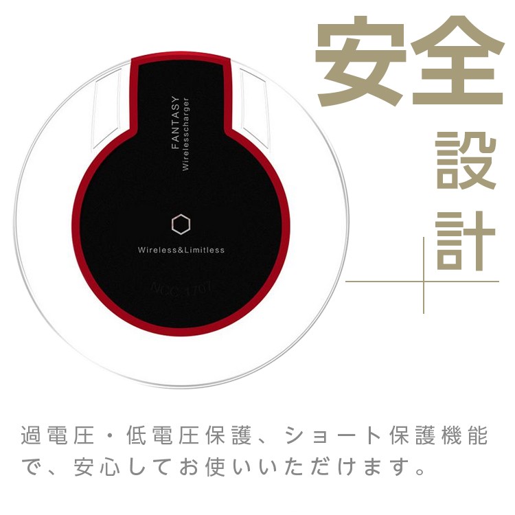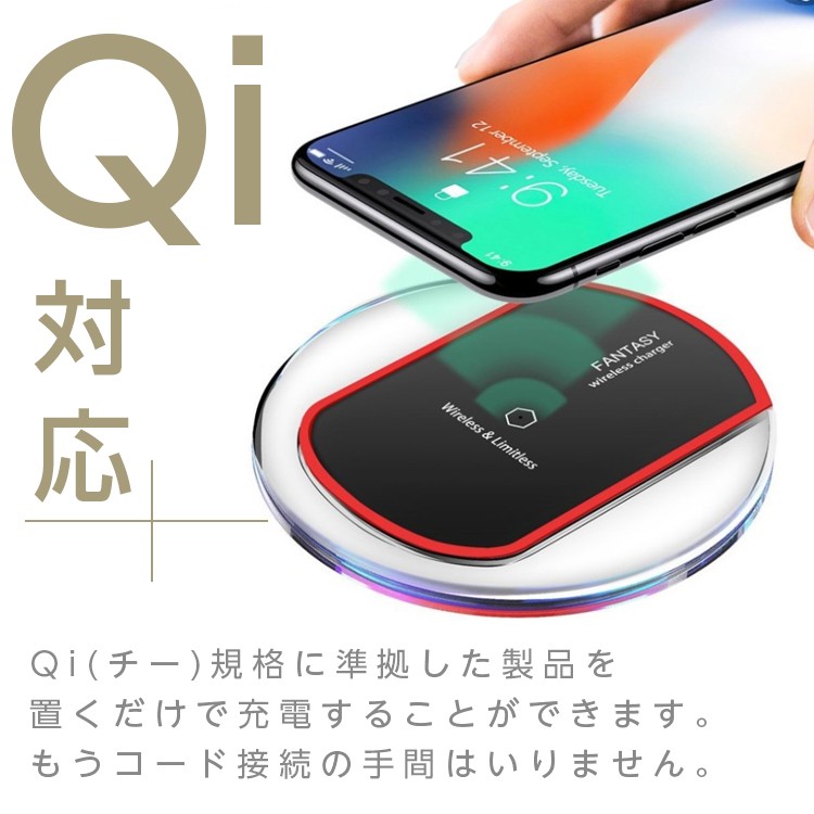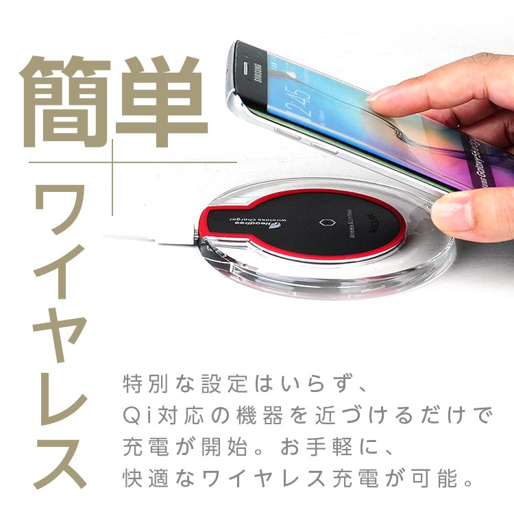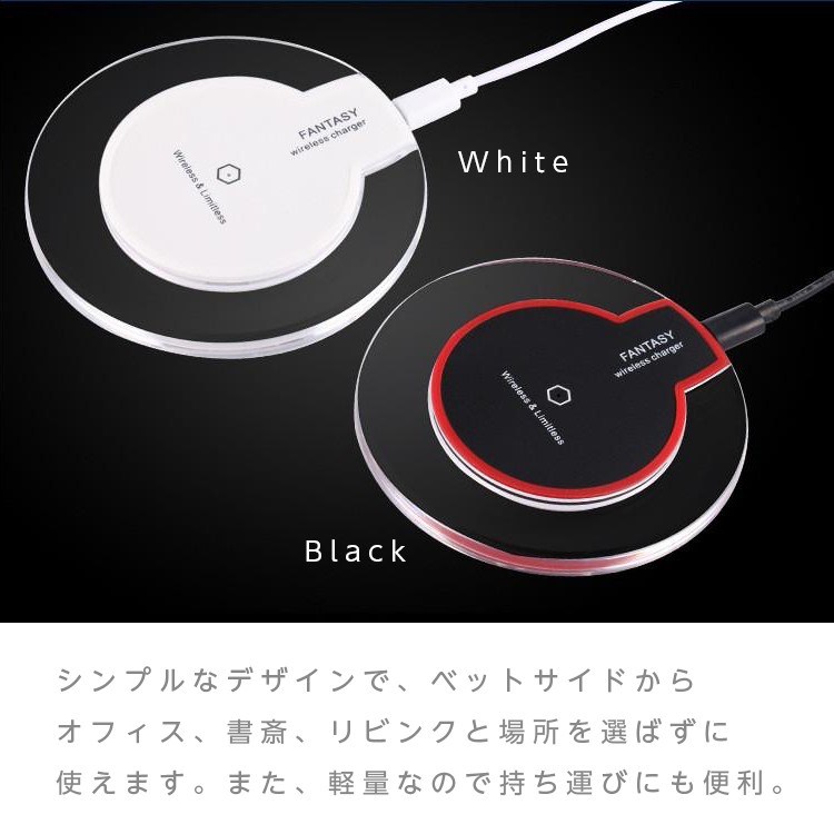 サイズ:145mm*84mm*9mm製品規格:Qi入力:5V/2A出力:5V/1A周波数:100-150 KHz電力転化率:73%無線距離:< 8mm充電時間:3時間認証:FCC, CE商品質量:80gカラー:ブラック、ホウイトQi ワイヤレス充電器 置くだけ充電パッド ワイヤレスチャージャー iPhoneX/8/8 Plus/Galaxy S6/S7/S6 Edge/S7 Edge Note8,SHARP,富士通,Kyocera,Panasonic,Motorola,Nokia その他Qi対応機種 【ワイヤレス充電】Qi対応機器またはQI対応カバーをつけた機器を置くとすぐに充電が可能です。ケーブルもUSB接続も必要ありません。【高品質チップ】 最高品質の材料と最先端の技術を合わせて、 高い品質のコイルとTIチップを採用により、待機モードは電力消耗がとても低い。【安定性】両面に滑り止めのゴムがあり、デスクの上に本体を滑り止めます。なお、機器を本体の表面に安定に充電することができます。(ケースを付けていると充電できない場合があります )。