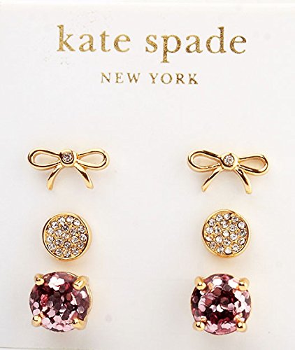 Shine from ear to ear. These sassy studs from Kate Spade New York feature glitter-infused epoxy stones set in 12k gold plated metal. This 3pc set includes a rose gold glitter gumdrop pair, pave disc pair and a gold bow with a tiny glass diamond embellishmentFeature
