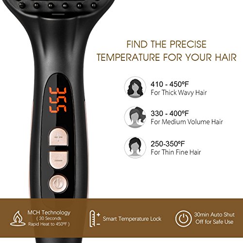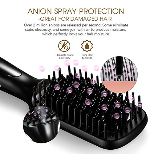 Color:Black Moisturizing and Hydrating Care This hair straightening brush offers upgraded anion spry, releasing over 2 million negative ions per second. The rich anions along with air produce moisture, perfectly hydrates your hair, making hair shinier and smoother. Quicker and Comprehensive Straightening Adopt MCH (Metal Ceramic Heater) technology, this hair straightener heats up in 30 seconds. Rectangular hair straightening brush offers more hair contact than oval ones, you will save about 30% time. Enjoy the high efficiency brought by this ceramic iron straightener detangling brush anion hair massager. Auto-off Function This hair straighten brush will auto-off after 30 minutes to avoid fire hazard as well as to save energy. No worries of fire hazard when leaving the straightener on by accident. Tangle-free wire Design 360° rotating wire keep you hold the device at any angle for the best straightening results. No more worry about wire twining and gives you a smooth experience every time. Convenient Temperature Reading Press " " and "-" at the same time to convert the temperature format. With both Celsius and Fahrenheit settings, you can read the temperature clearly and correctly on the LED display, and to your liking with an easy press. Packing List Hair Straightening Brush x 1 Waterproof Storage Bag x 1 Heat- resistant Glove x 1 Clean Brush x 1 User Manual x 1 0 |
