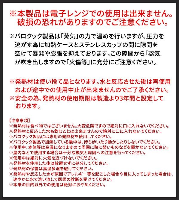 | 素材・材質 | 加熱ケース・キャップ:樹脂(PP)、スリーブ:ネオプレーン素材、カップ:ステンレス、パッキン:シリコンゴム、発熱材:生石灰 |