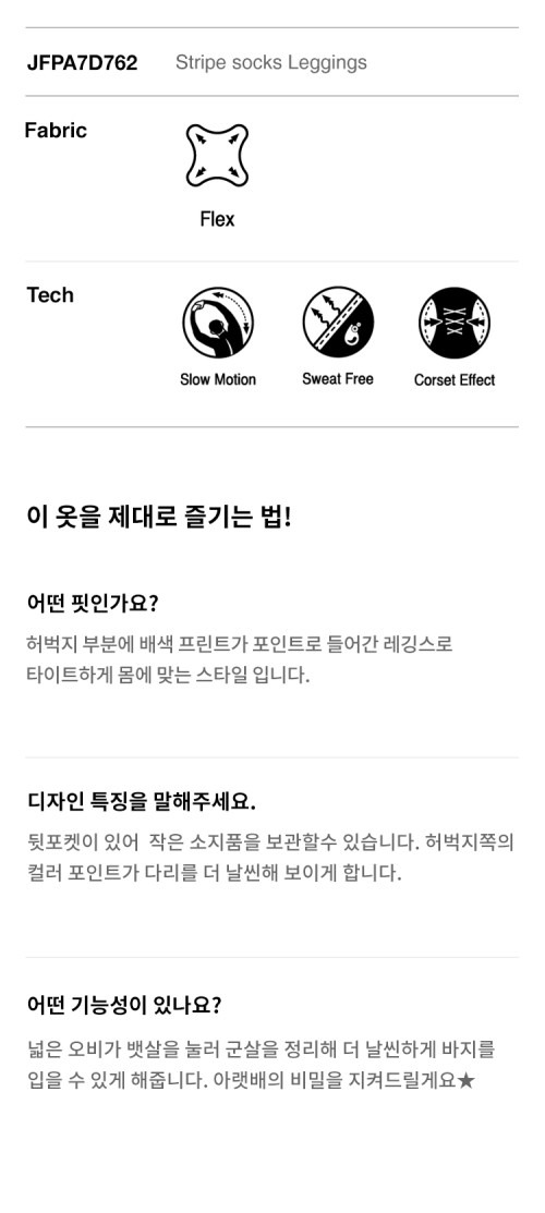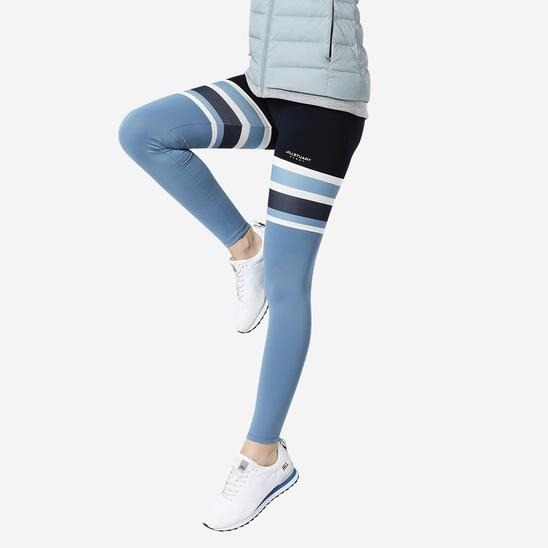 허벅지 부분에 스트라이프 패턴을 배색하여 포인트를 준 레깅스 팬츠입니다.
