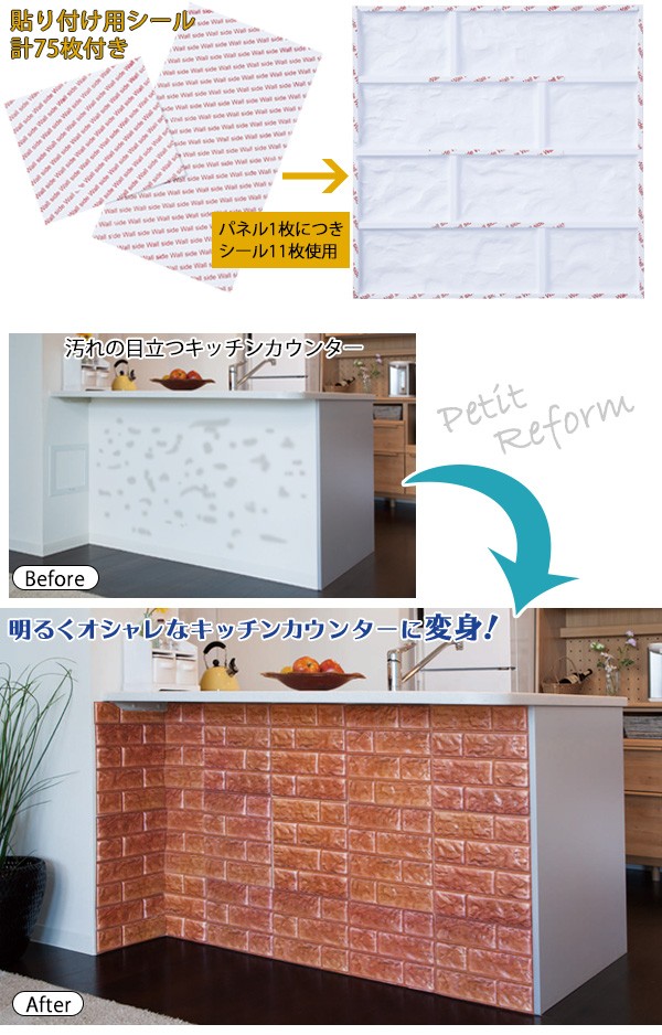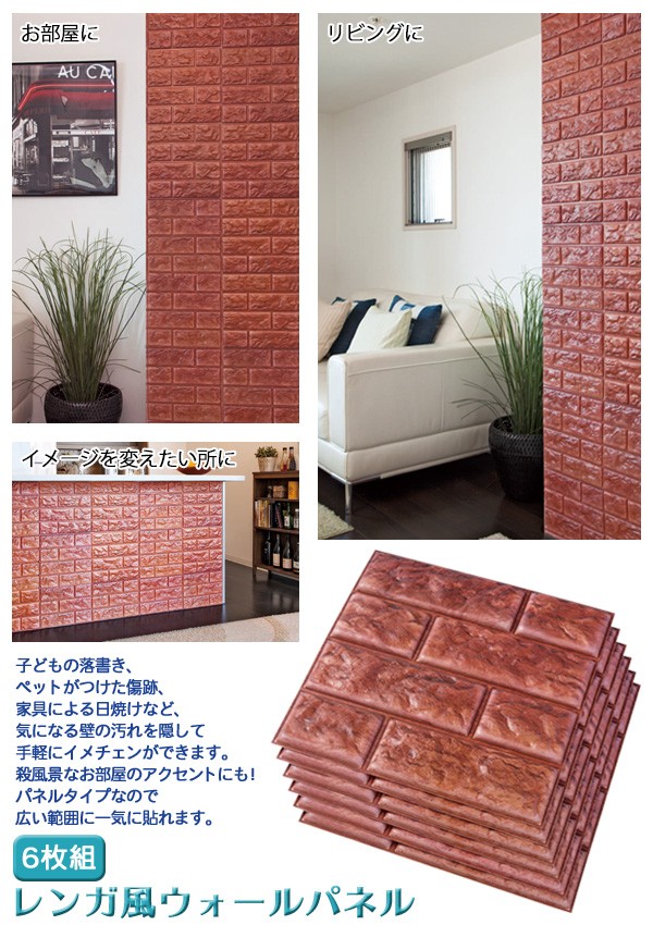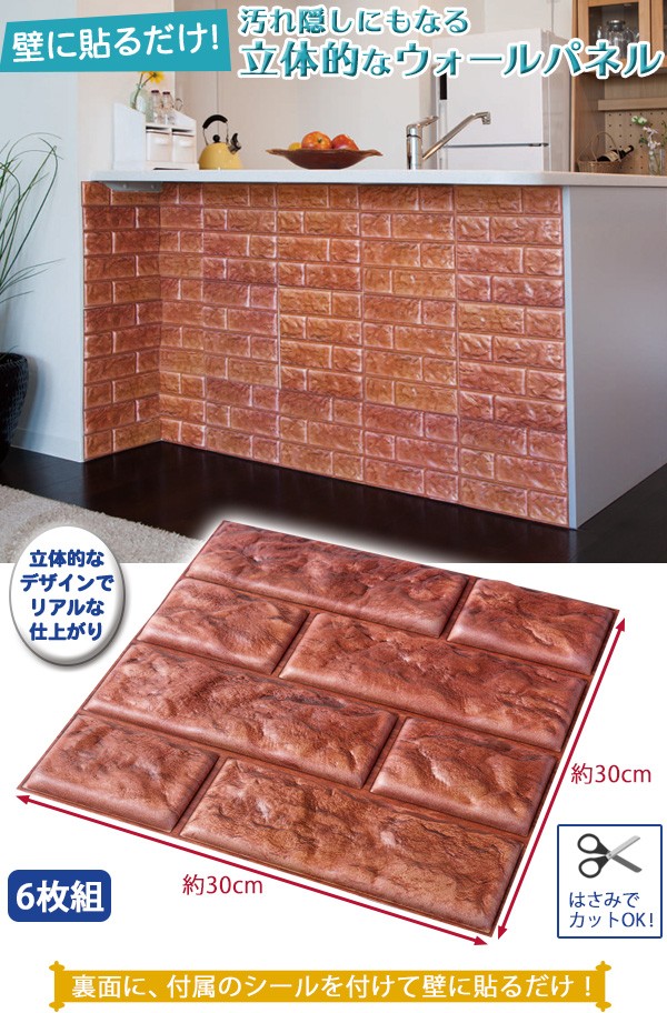 | シールで貼るだけ!壁の汚れ隠しにもなる立体的なウォールパネル。子どもの落書き、ペットがつけた傷跡、家具による日焼けなど、気になる壁の汚れ隠しに。殺風景なお部屋のアクセントにもなります。広い範囲に一気に貼れるパネルタイプで、付属のシールを裏面に付けて壁に貼るだけ!手軽にプチリフォームできます。6枚組/カットOK/レンガ柄/インテリアシール/ウォールステッカー/DIY/簡単/おしゃれ/ |