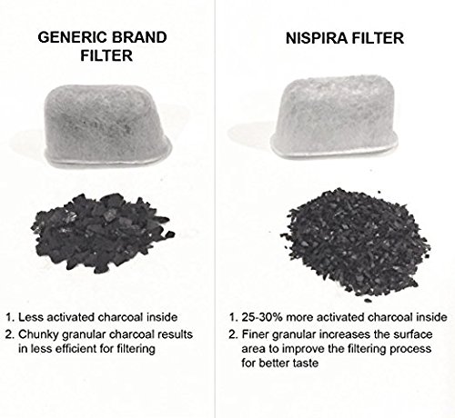 NISPIRA premium filters use finer granular activated charcoal to enhance the filtering process for better taste. With 25-30% more activated charcoal inside for longer use compared with the other generic brand. Suggested replacement after 60 days. more often if you have hard water