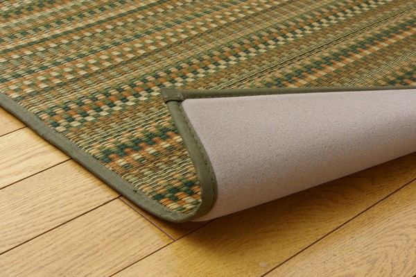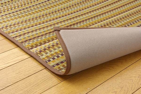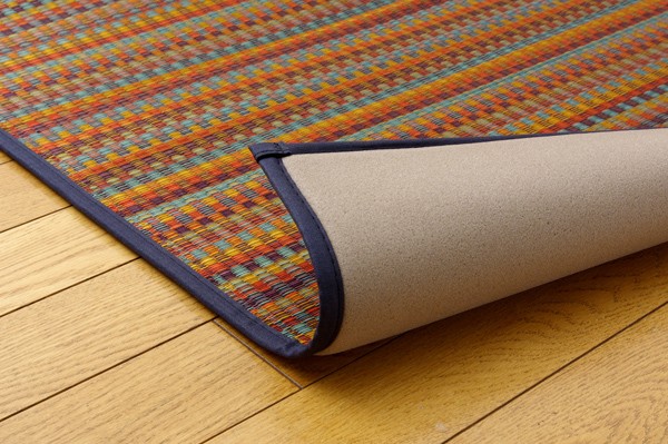 多色を使いながらも落ち着いた雰囲気に仕上げたイ草カーペットです。ベージュ、ブルー、ブラウン、グリーンの4色展開です。お部屋に合わせてお好きな色をお選び下さい。国産(九州産)のい草を使用しています。一本一本が太く、表皮が厚く繊維がキメ細かいので弾力性があり、耐久性に優れています。い草には空気の自然浄化作用、湿度の調節作用などがあります。また汚れにくく、使用するうちに黄金色に変化し味が出ます。裏にはウレタンを貼っていますので適度なクッション性があり、フローリングでのご使用にも適しています。い草に青森ヒバ加工を施しています。(抗菌、防臭効果)