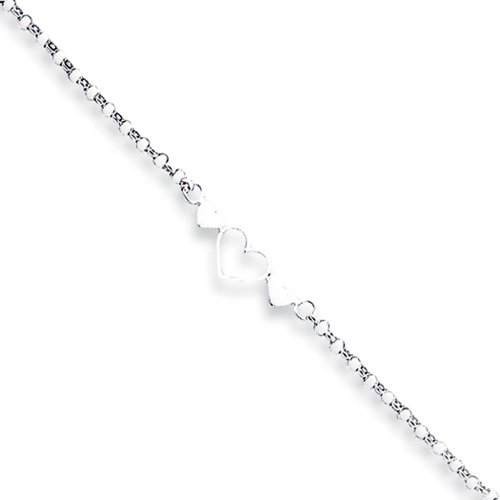 Flirty and feminine, this triple heart bracelet will wrap around your ankle with elegant sensuality. It is designed from polished sterling silver, features a 2mm width solid link rolo chain finished with a spring ring clasp and is adjustable in length from 9 to 10 inches. The open heart in the center is approximately 7mm in width.Feature
