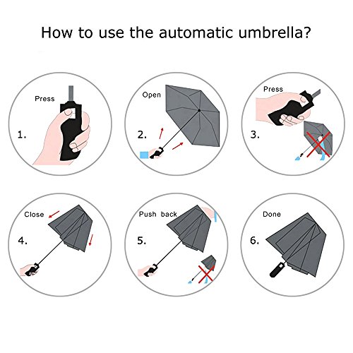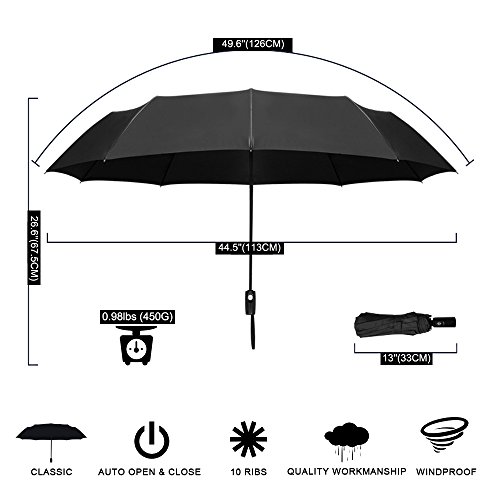 -. Feature : ☂DURABLE and STURDY☂HEIHEI windproof umbrella has a Black Metal Shaft and 10 Reinforced Fiberglass Ribs that can stand 65 mph wind gusts, and help to minimize the chance of flipping umbrella inside out. / ☂AUTOMATIC OPEN and CLOSE☂Auto-open function helps you get instant cover from rain with an impressive fast and simple opening action. Auto-close is quite convenient for you to make quick entry into the tent, taxi, or building. You can easily get a one-handed operation. / ☂WATERPROOF and WINDPROOF☂HEIHEI ultimate and auto open/close umbrella is made of 100% polyester 210T pongee fabric, which is ultra WATER RESISTANT and ANTI-MOLD; And strong enough to protect you when rains cats and dogs. The double-canopy design and sturdy frame will ensure the umbrella is DEFINITELY WINDPROOF. Never get caught in natural elements again, like rain, gale, hail or hot sunlight. / ☂COMPACT and SUPER LIGHTWEIGHT☂It is 13" when folded up, easily fits in your work bag, purse, backpack, car container etc. Total weight of this compact umbrella is 0.98LBS, and it is designed with a handy wrist strap to portable carry around. / ☂PRODUCT GUARANTEE☂If there is any problem of quality to your folding travel umbrella within 360 days, please send E-mail to us and we will try our best to help you, no return required!