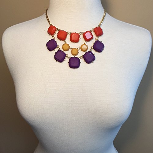 3 Row Squares Multi Color Gold Tone Bib Statement Necklace Earrings Set (Purple Orange Yellow)