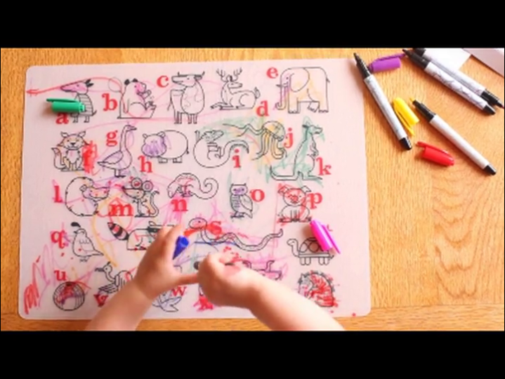 Reusable coloring placemat made from FDA-approved, food-grade silicone that helps provides fun at mealtime at home or on the go