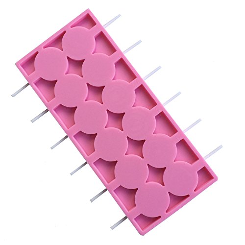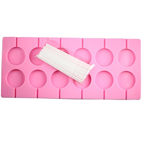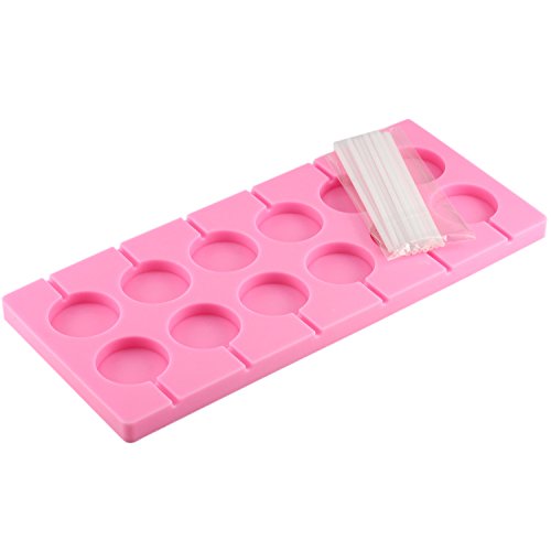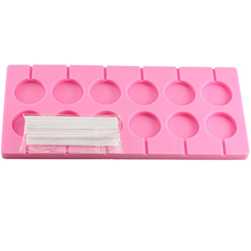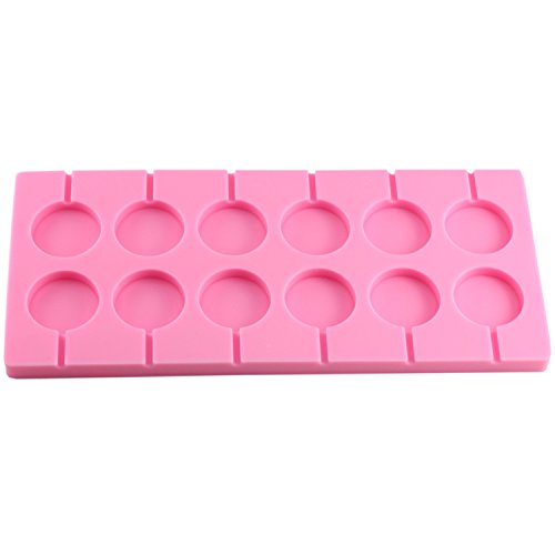 The lollipop molds have 12 hole round candy molds with stick, silicone mold color is pink.