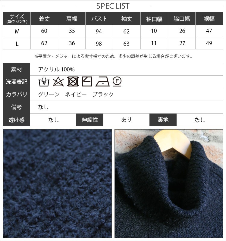 L:着丈 62cm 肩幅 36cm バスト 98cm 袖丈 63cm 袖口幅 11cm 脇口幅 27cm 裾幅 49cm